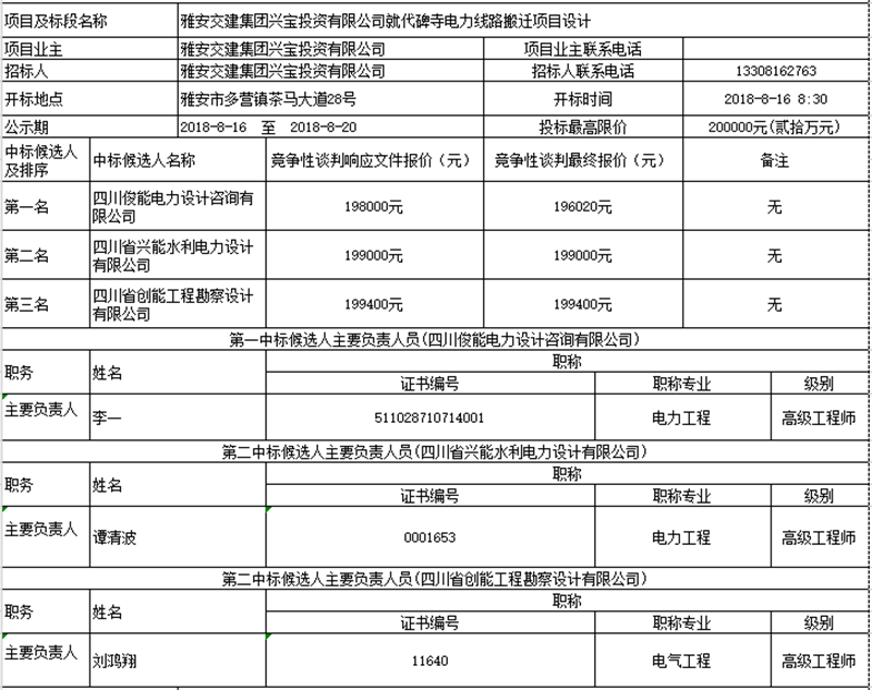 K8凯发建设集团兴宝投资有限公司就代碑寺电力线路搬迁项目设计竞争性谈判中标候选人公示