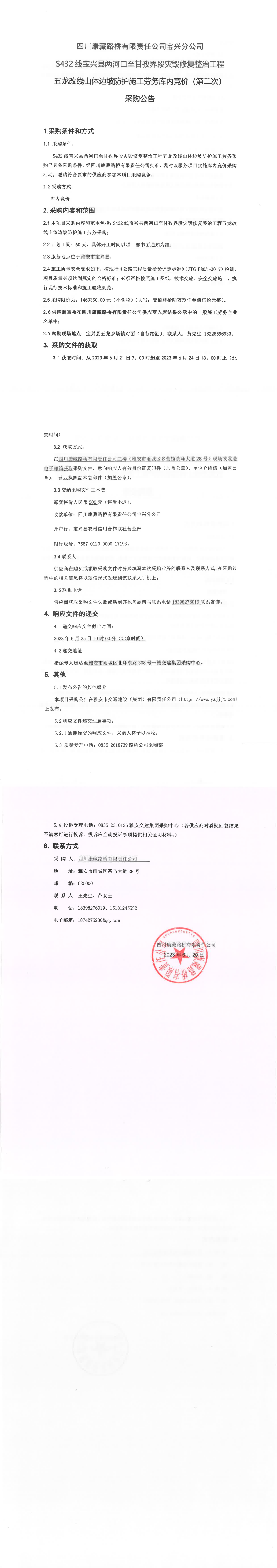 四川康藏路桥有限责任公司宝兴分公司S432线宝兴县两河口至甘孜界段灾毁修复整治工程五龙改线山体边坡防护施工劳务库内竞价(第二次)采购公告