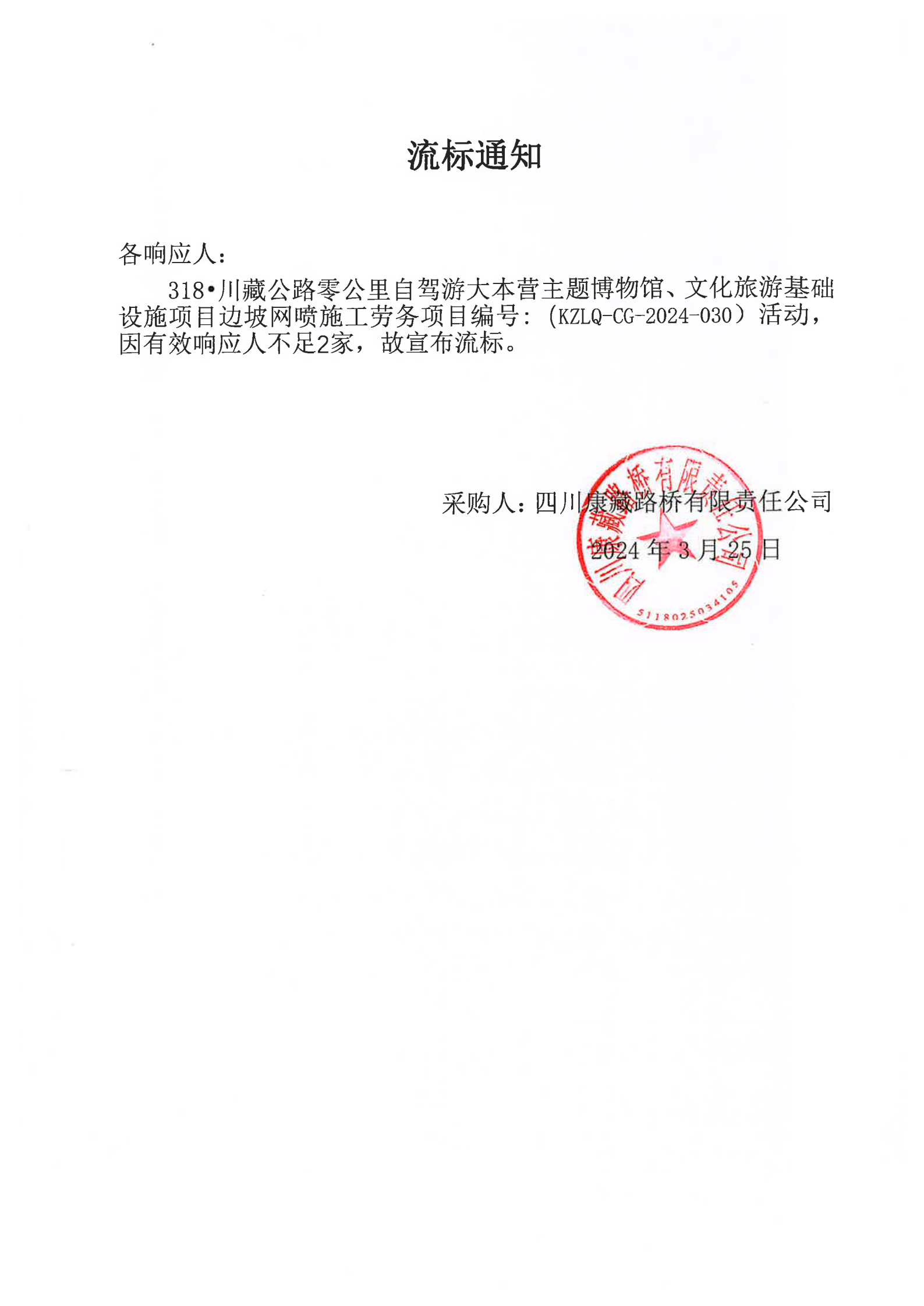 四川康藏路桥有限责任公司318·川藏公路零公里自驾游大本营主题博物馆、文化旅游基础设施项目边坡网喷施工劳务流标通知