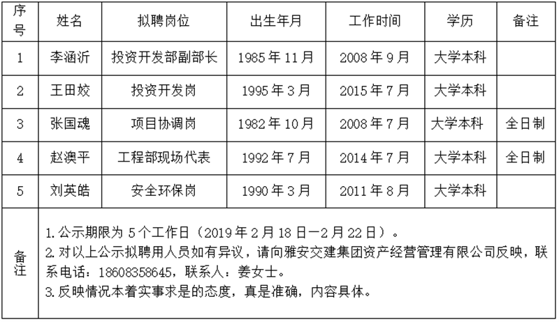 顺利获得公开报名、资格审查、笔试、面试等程序,经K8凯发建设集团资产经营管理有限公司研究,对以下5名拟聘用人员予以公示: