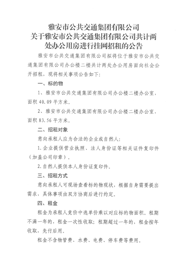 关于雅安市公共交通集团有限公司共计两处办公用房进行挂网招租的公告