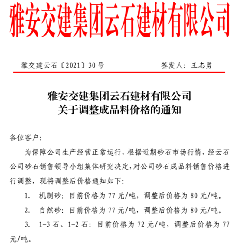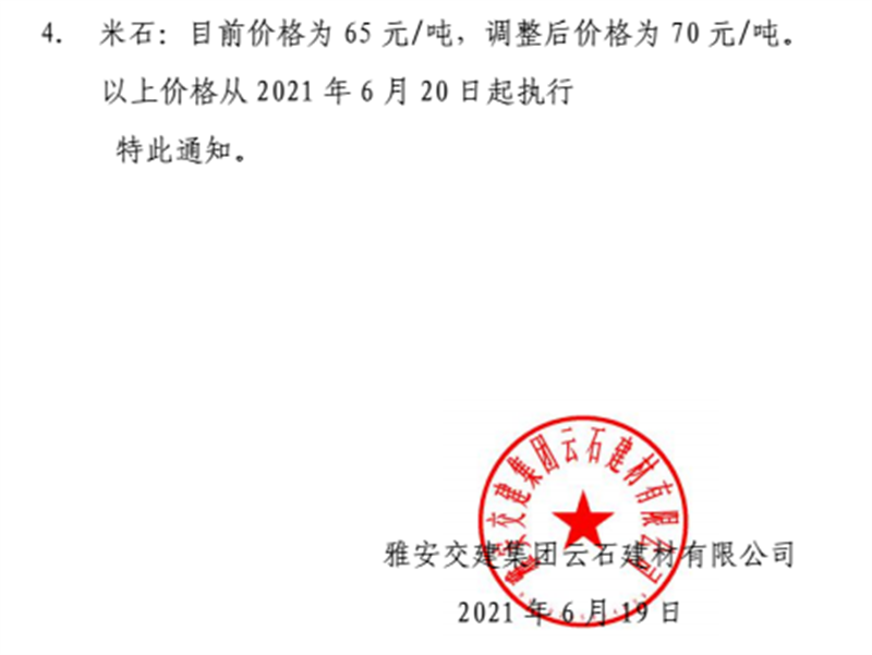 K8凯发建设集团云石公司砂石骨料销售价格情况表(2021.6.20)