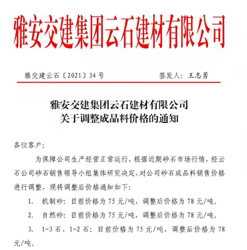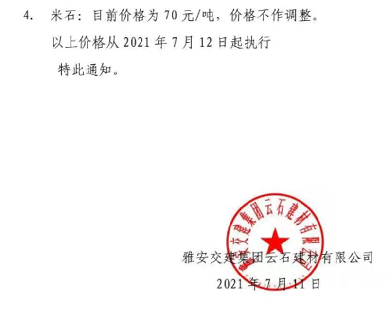 K8凯发建设集团云石公司砂石骨料销售价格情况表(2021.7.12)