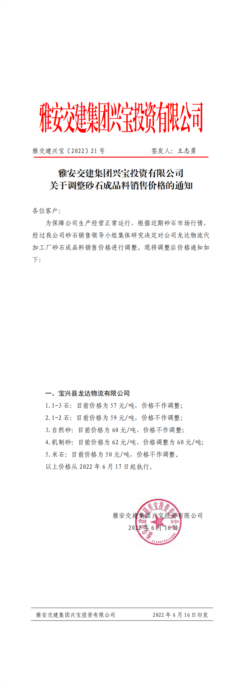 K8凯发建设集团兴宝投资有限公司 关于调整砂石成品料销售价格的通知(2022.6.16)